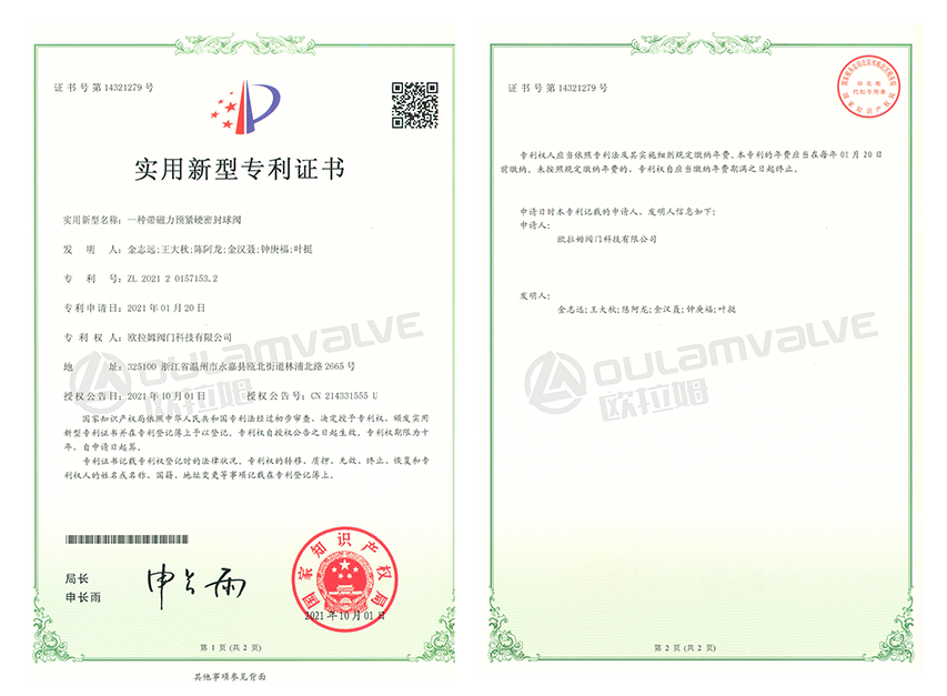 本實用新型公開了一種帶磁力預緊硬密封球閥,包括閥體,閥體兩側(cè)均連接有閥蓋,閥體內(nèi)設(shè)有閥球,閥體頂端連接有執(zhí)行器,執(zhí)行器用于驅(qū)動閥球在閥體內(nèi)轉(zhuǎn)動,閥蓋靠近閥球一側(cè)分別設(shè)置磁力機構(gòu),磁力機構(gòu)與閥球之間設(shè)置硬密封閥座,為硬密封閥座與閥球提供密封力;通過在閥蓋靠近閥球一側(cè)分別加裝磁力機構(gòu),當閥門關(guān)閉時,線圈部件通電,磁鐵與線圈部件之間產(chǎn)生的電磁效應,產(chǎn)生相反的磁場,將磁鐵推向閥球一側(cè),由磁鐵將硬密封閥座抵在閥球一側(cè),為硬密封閥座與閥球提供密封力,完成閥球在閥體內(nèi)的固定,從而提升球閥的密封性能,閥球轉(zhuǎn)動時,不與硬密封閥座直接接觸,不易磨損,可有效提升球閥的使用壽命。