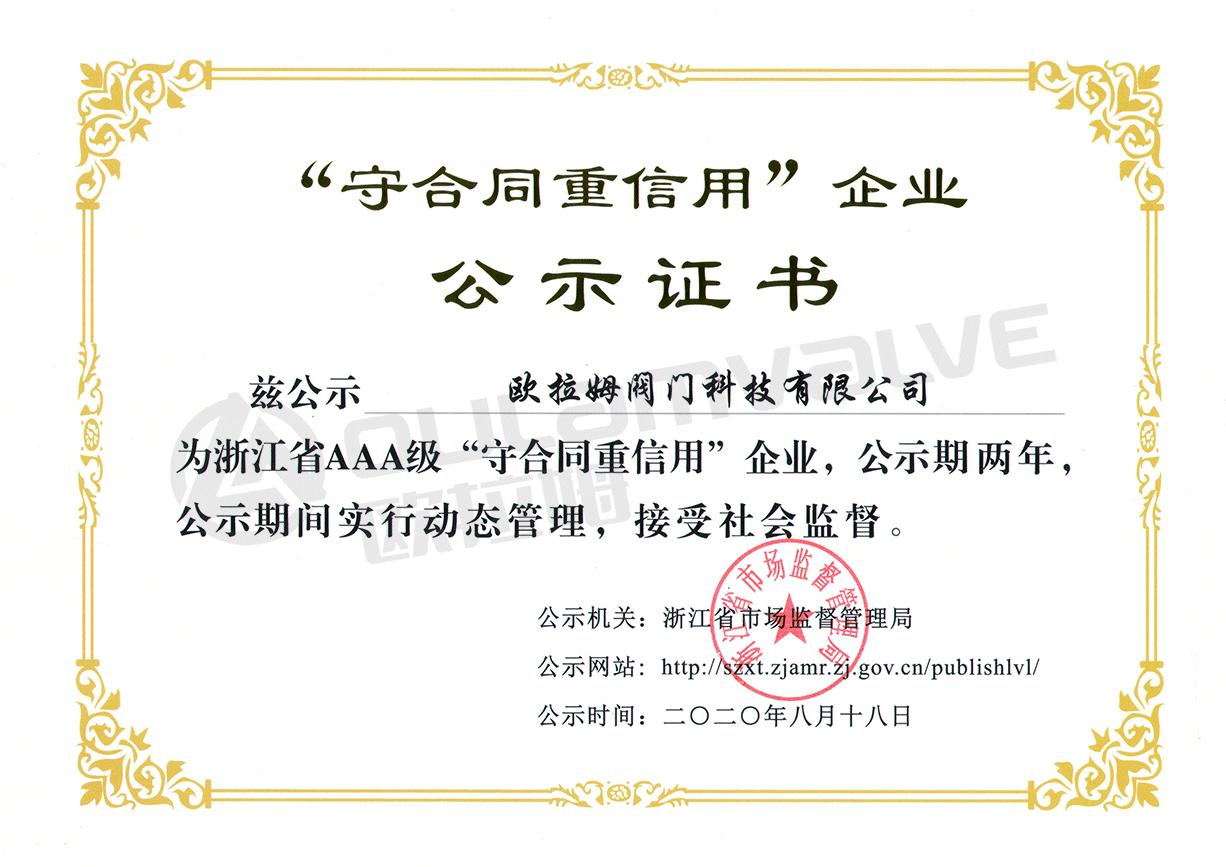 浙江省AAA級守合同重信用企業(yè)證書