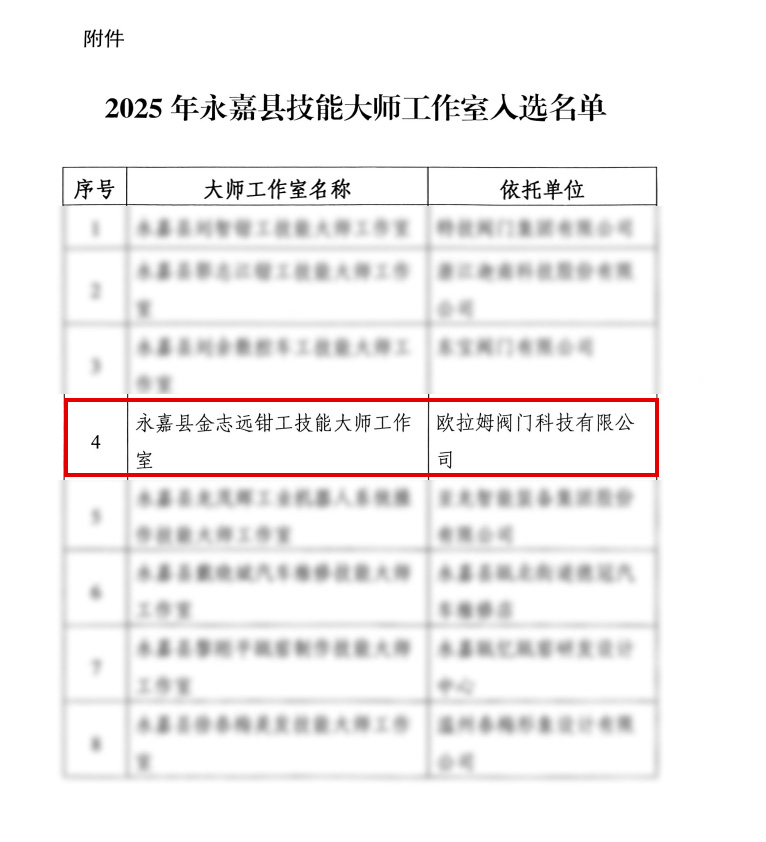 近日,浙江永嘉縣委人才工作領(lǐng)導(dǎo)小組辦公室、永嘉縣財(cái)政局、永嘉縣人力資源和社會(huì)保障局聯(lián)合發(fā)布《關(guān)于公布2025年永嘉縣技能大師工作室名單的通知》,歐拉姆閥門科技有限公司高級(jí)鉗工技師金志遠(yuǎn)領(lǐng)銜的“永嘉縣金志遠(yuǎn)鉗工技能大師工作室”成功入選。作為全縣8家獲認(rèn)定工作室之一,標(biāo)志著歐拉姆閥門在高端閥門制造領(lǐng)域的技術(shù)傳承與創(chuàng)新突破邁入新階段。