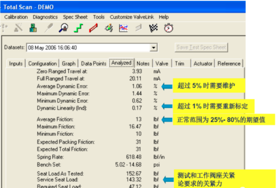 提供閥門動態誤差帶曲線,以及分析平均動態誤差;平均線性度;閥門的滯后與死區等數據,以決定何時閥門需要重新校驗或檢修。